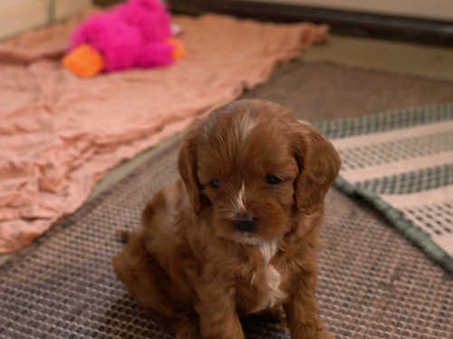 Lacey is a beautiful red Cavapoo girl with striking white markings that give her a truly one-of-a-kind look. Along with her unique coloring, she has a bright, affectionate personality and a naturally happy spirit that makes her easy to fall in love with.